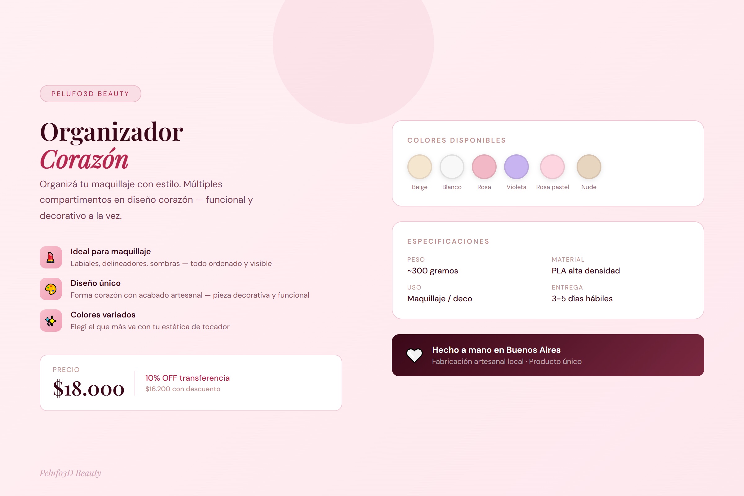 Múltiples compartimentos en diseño corazón para mantener tu maquillaje ordenado y a la vista. Ideal para labiales, delineadores, sombras y accesorios pequeños. Fabricado en PLA artesanal en Buenos Aires, disponible en 6 colores.