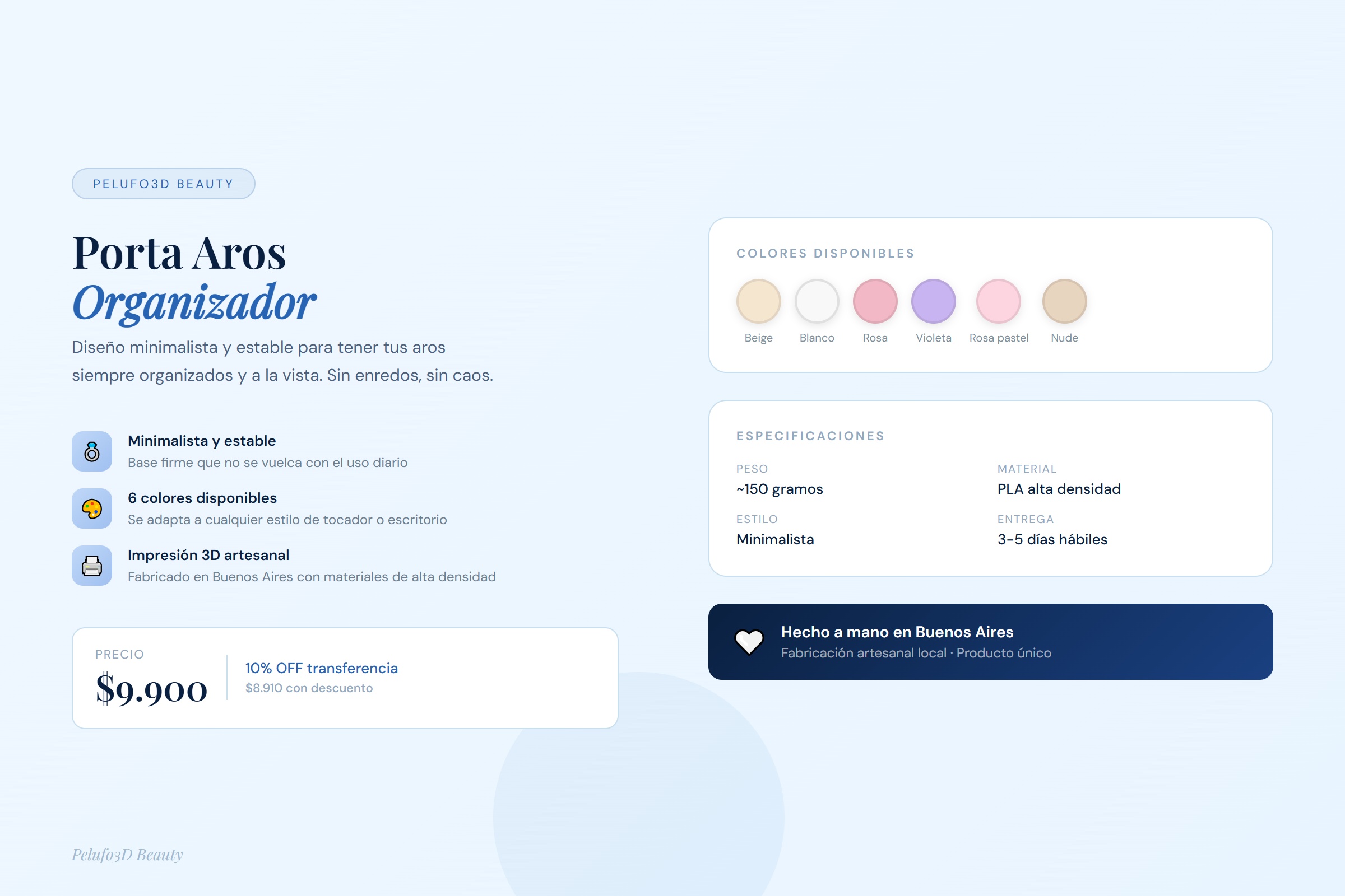 Diseño minimalista para exhibir tus aros favoritos. Base firme y antideslizante, ocupa poco espacio en el tocador. Impreso en PLA en Buenos Aires. Disponible en 6 colores: nude, blanco, rosa, violeta, rosa pastel y negro.